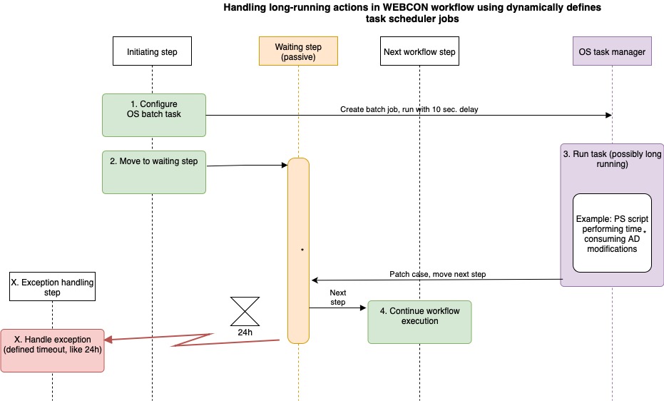 My current solution is to use a scheduled Windows Task (created via a PowerShell integration action in WEBCON), then transition the workflow to a system step (without assigned tasks) to passively wait for the scheduled task to complete. The scheduled task retrieves its parameters either from the command line (passed during job creation) or by connecting to the BPS database. It’s essential that the scheduled job issues a PATCH API call back to the originating workflow instance to continue the process flow. Although the solution might sound complex, it has been running reliably in a production environment.