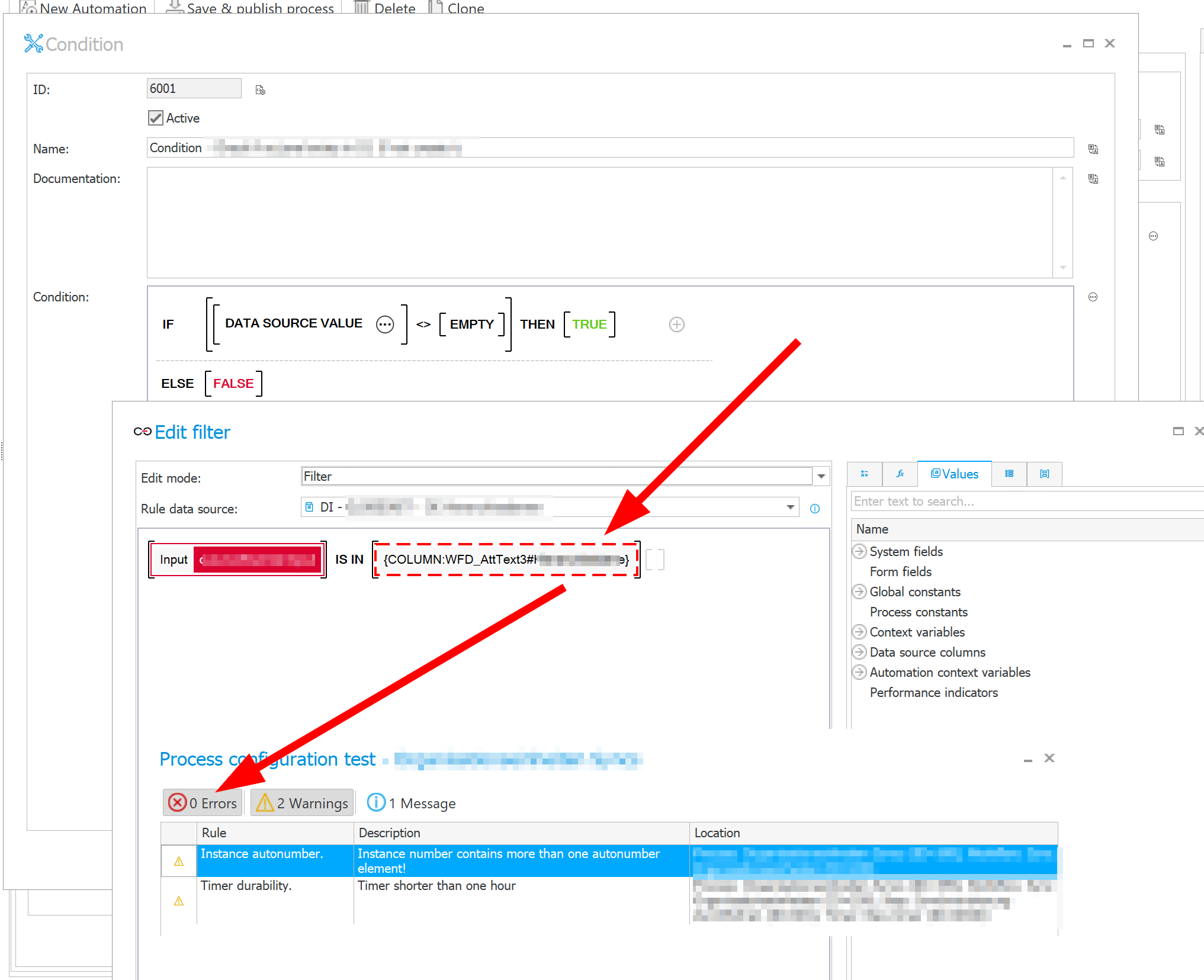 Unfortunately there is no warning and I had to search manually and found a broken one in a "data source value" filter as shown in the screenshot.