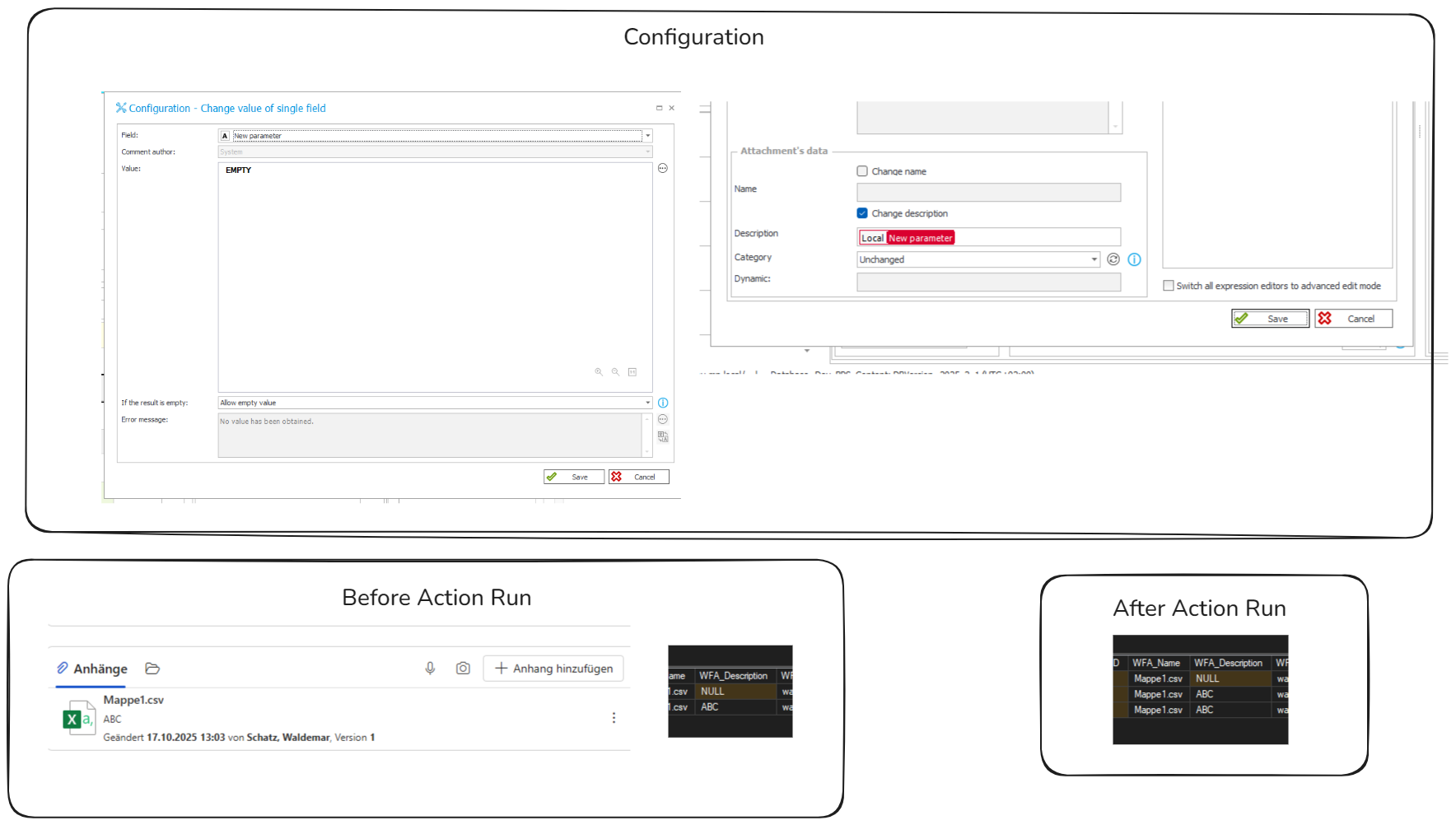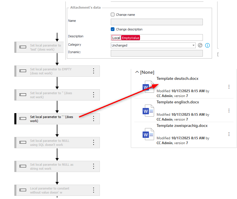 I've used the "Update attachment" action, ticked the bock to change the description and tried: