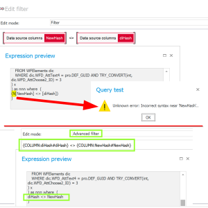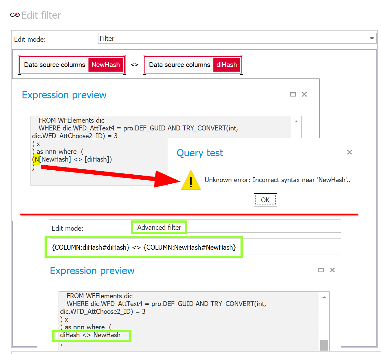 In the normal editor using [Data source columns | newHash] <> [Data source columns | diHash] leads to the SQL code (N[newHash] <> [diHash]). The "N" causes the error "Incorrect syntax near 'newHash'".