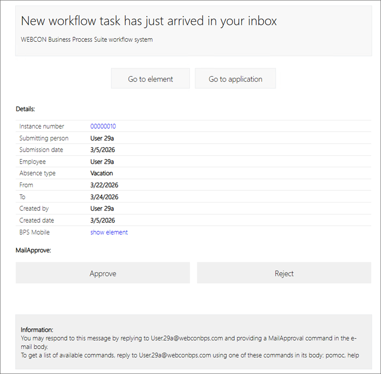 In the absence request workflow, at the Approving step, it is possible to approve or reject the request both by using the buttons on the form and by replying to the standard email message sent when the task is assigned to the approver.