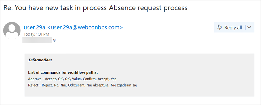 After an email reply containing one of the predefined words, for example “OK”, “Confirm”, “Yes”, or “Accept”, is sent, the system approves the absence request and moves it along the selected path to the next step of the workflow. At the same time, the approver receives a confirmation message indicating that the task has been completed, together with the path that was used.