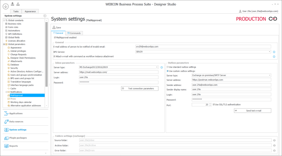 Open WEBCON Designer Studio, go to the System settings tab, and select the branch MailApproval.