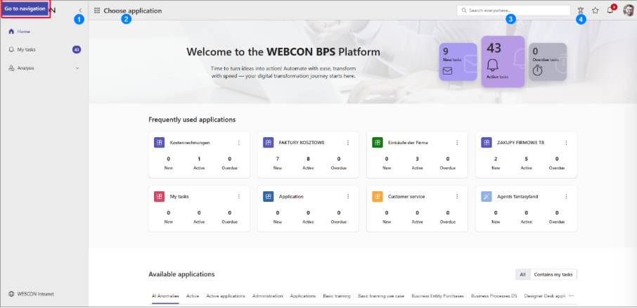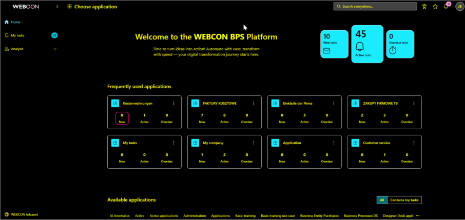 Fig. 13. Portal home page with the WEBCON Contrast Black Yellow theme enabled