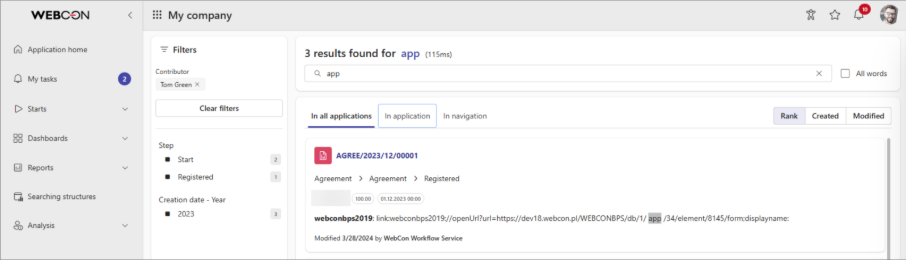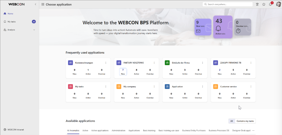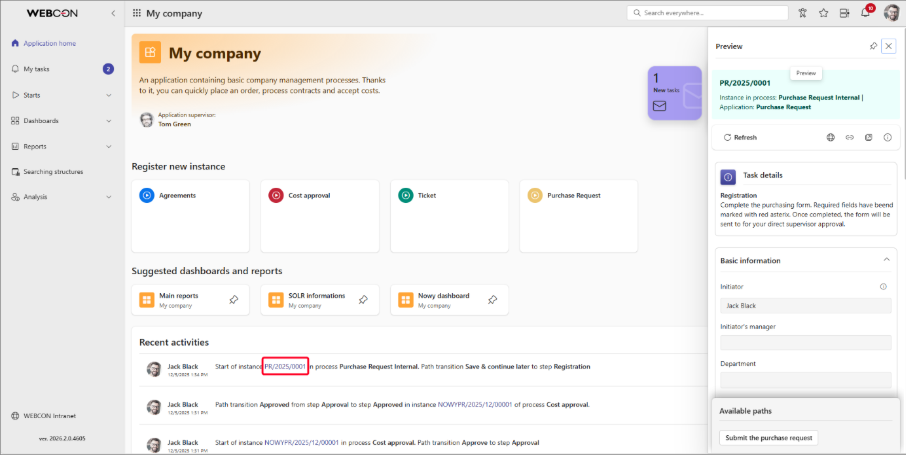 A similar solution has also been introduced on the application page. Users will now be able to move more quickly without the use of the mouse through its elements, such as Suggested dashboards and reports (including pinning them) or Recent activities where it is now possible to open a preview of a workflow instance based on a selected link.