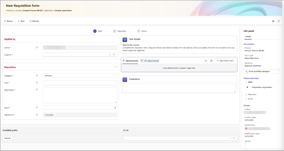 On the form, users will be able to navigate editable input fields, Menu buttons, and select Paths in a similar manner. It will also be possible to set focus on the Info panel, Attachments and Comments sections and their respective elements.