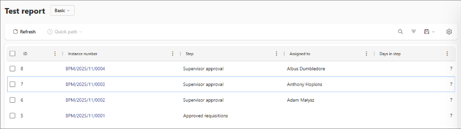 In the case of table reports, users will find it simple to select Menu buttons, icons directly related to report configuration and filtering, report column headers, rows, Instance numbers leading to workflow instances, action menus, as well as elements of all related context menus. Similarly, users will be able to freely navigate through the reports views such as Charts (legend, series support), Calendars, or KPIs.