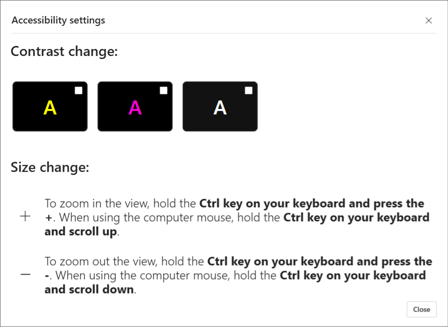 It allows users to quickly change the Portal theme to WEBCON Contrast Black Yellow or any other custom theme marked as contrast. After deselecting the theme, the default theme is restored. The window also has an educational function: there are universal prompts for the user to resize the screen using the mouse or keyboard, which vary depending on the operating system used.