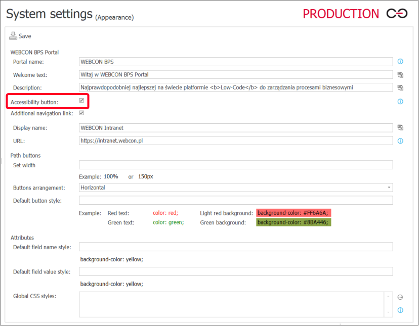 To display the accessibility icon in the top menu in Portal, it is necessary to check the dedicated Accessibility button box in WEBCON BPS Designer Studio (System settings → Global parameters → Appearance).